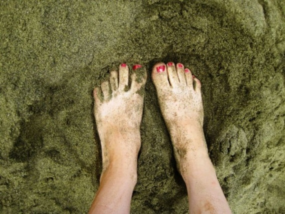 Пляж Папаколеа (Papakolea Beach) еще называют пляжем зеленого песка. Он находится в Саус Пойнт на острове Гавайи. Окружающий пепловый конус, состоящий из кристаллов хризолита придает пляжу зеленый оттенок. Если вы будете смотреть на пляж издалека, то он будет казаться совершенно зеленым, но если вы возьмете горсть песка и взгляните поближе, то увидите больше золотистых оттенков кристаллов.