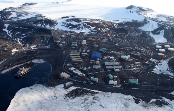 Аэрофотосъемка станции Мак-Мердо. Слева — шведский ледокол ODEN. Голубое здание в центре — «Здание 155», в котором находится кафе, парикмахерская, магазин, несколько офисов и некоторые комнаты общежития. Коричневые здания слева от нее — общежития. Большая часть остальных зданий — это рабочие центры и складские помещения. (National Science Foundation/Curtis Harry)