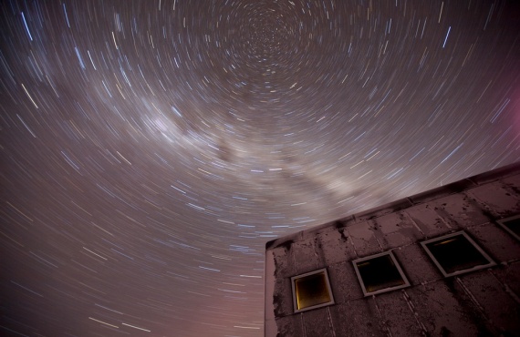 20-минутная экспозиция южной небесной оси над станцией Амундсен-Скотт. (National Science Foundation/Patrick Cullis)