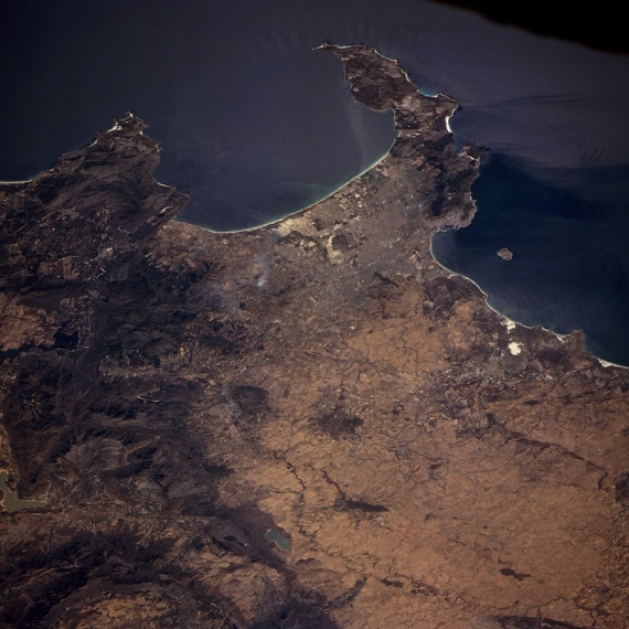 Кейптаун, Ложная бухта (вверху) и Столовая бухта с островом Роббен (справа), вид из космоса: