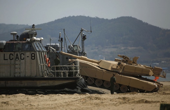 Учения американцев и южнокорейцев, которые так не нравятся Северной Корее. Город Пхохан, 22 апреля 2013. Танк M1A1 Абрамс.