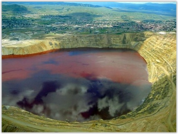 Более одной мили длинной и пол мили шириной, 1780 футов глубиной, 900 из которых заполнены черезвычайно ядовитой водой. Кислотная вода включает в себя химикалии — мышьяк, кадмий, цинковая и серная кислота, если бы вы попробовали хотя бы чуть чуть, то моментально бы отравились!
