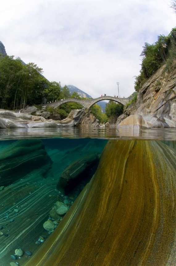 Несмотря на то, что глубина реки Верзаска (Verzasca) 15 метров, вода настолько в ней кристальная, что без труда можно рассмотреть мостик над ней. 30-километровая швейцарская река известна во всем мире своими бирюзовыми водами.
