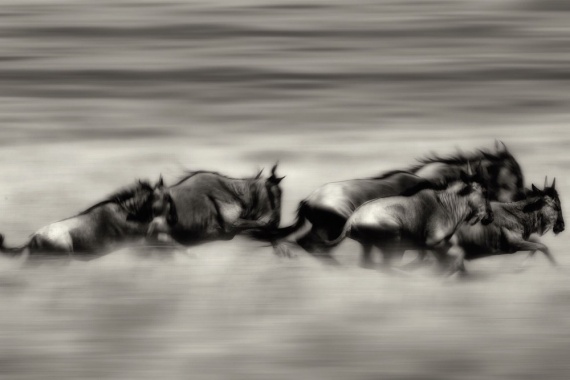 12. Стадо гну во время миграции по равнинам Масаи Мара в Кении.