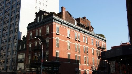 Три небольших дома на крыше здания на Бродвее, Нью-Йорк (США).