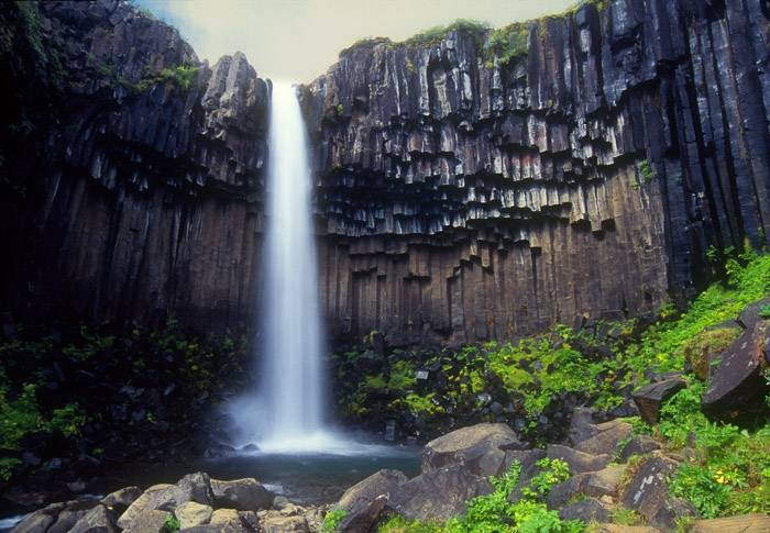 Результатом вечной борьбы огня и воды на этой масштабной местности стали, пожалуй, одни из самых странных и сюрреалистических пейзажей планеты. Заночевать в кемпинге среди зелени березовой рощи, окруженной черной пустыней и ледниковыми реками – опыт незабываемый! А от кемпинга можно дошагать до таких природных жемчужин, как водопад Свартифосс, низвергающийся вдоль черных базальтовых скал, знаменитую ледяную пещеру или великолепную лагуну Ёкюльсаурлоун, знаменитую своими лазурно-голубыми глыбами льда.