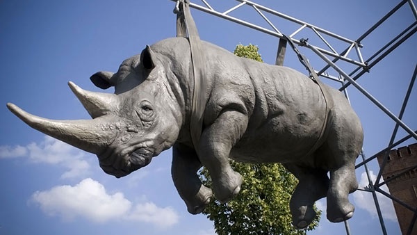 Скульптура белого африканского носорога в натуральную величину, подвешенного на лямках к металлическому каркасу, была установлена в 2005 году. Автор работы – итальянский художник и скульптор Стефано Бомбардьери – изобразил его обиженным и грустным, вызывающим сочувствие. И выиграл за него несколько престижных наград. К слову, белый носорог встречается намного реже, чем его собрат – африканский черный носорог. Правда, он совсем не белый, а скорее грязно-серый.