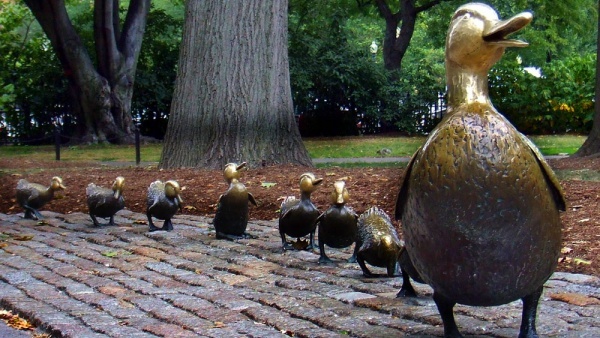 Скульптурная композиция работы Нэнси Шен изображает героев популярной детской книжки Роберта Макклоски «Дайте дорогу утятам» — утку Миссис Мэллард и ее детей, которых зовут Джек, Кэк, Лэк, Мэк, Нэк, Уэк, Пэк и Квэк. Согласно сюжету книги, семейство Мэллард долго искало место для дома, пока не обрело его на маленьком острове на Чарльз-ривер в Общественном саду Бостона. Точную копию памятника с 1991 года можно увидеть и в Москве, в сквере Новодевичьего монастыря.