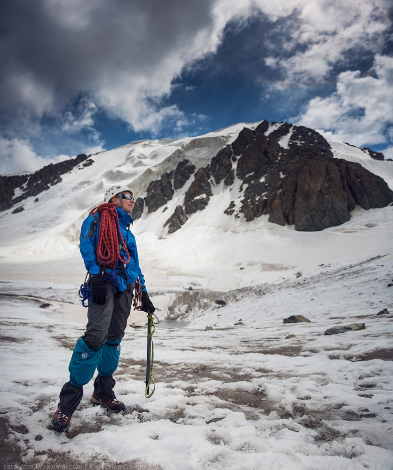 21. Мокрые, замерзшие, но довольные выбираемся на открытую часть ледника, где лёд под ногами уже твердый. Такое ощущение, что стоишь в чаше из хрусталя, горы подпирают небо. Здесь так близко к небу, к облакам, что кажется – можно дотянуться до них рукой. Саша покушается на ближайшую вершину :-)