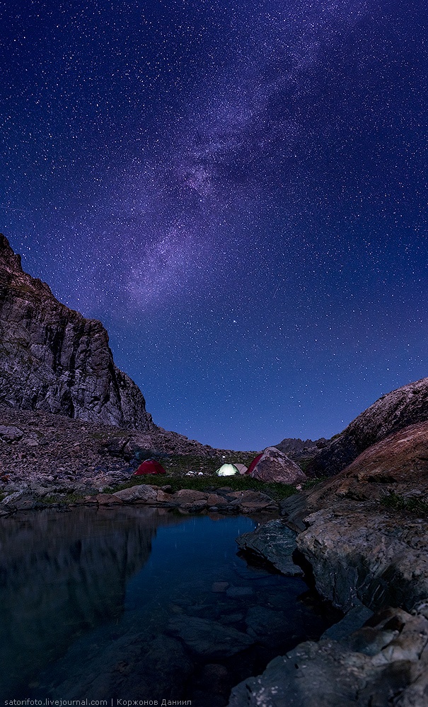 5. Вечером – наша первая стоянка на берегу озера. Млечный путь тут хорошо просматривается, ночь холодная и безлунная. Пока снимал — чуть в озеро не сел, а оно холоднющее! (впрочем, это не отбило желания у девушек искупаться).