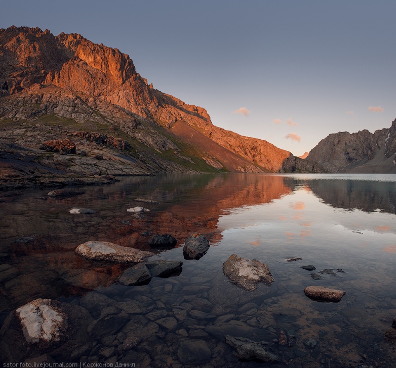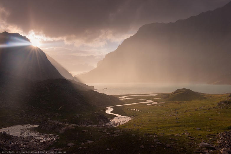 4. Награда нам за старания – вид на вечернее озеро Алакёль на высоте 3,5 тысячи метров. Озеро питает большой ледник с каракольской стены, а вытекает оно в узкий слив. Как будто кто-то вынул пробку из берегов – и озеро медленно сливается, давая начало большому водопаду. Мы решаем встать на другом берегу «слива». Казалось бы, один прыжок – и ты на другом берегу. Но за своих ребят очень переживаю: внизу – пропасть, вода низвергается бушующим потоком водопада.