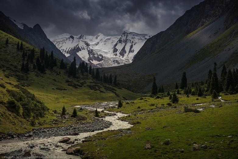 12. Тянь-Шань не спутаешь ни с какими горами: такое обилие скота, зеленых лужаек, высочайших пиков не встретишь нигде. Высокими прямыми стрелами сосны в долинах пронзают небеса, лошади провожают нас взглядом. Чувствуется, что горы дышат, живут – это самые яркие, самые зеленые горы, в которых я бывал. Даже в пасмурный день у подножия ледников изумрудные поля короткой травы расстилаются перед зрителем.