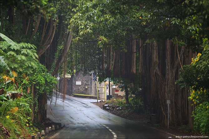 Узкая дорога проходит через огромный баньян. Беда местных дорог – отсутствие пешеходных дорожек. Пешеходу там просто жутко передвигаться. После проезда автобуса легко можно оказаться в канаве…
