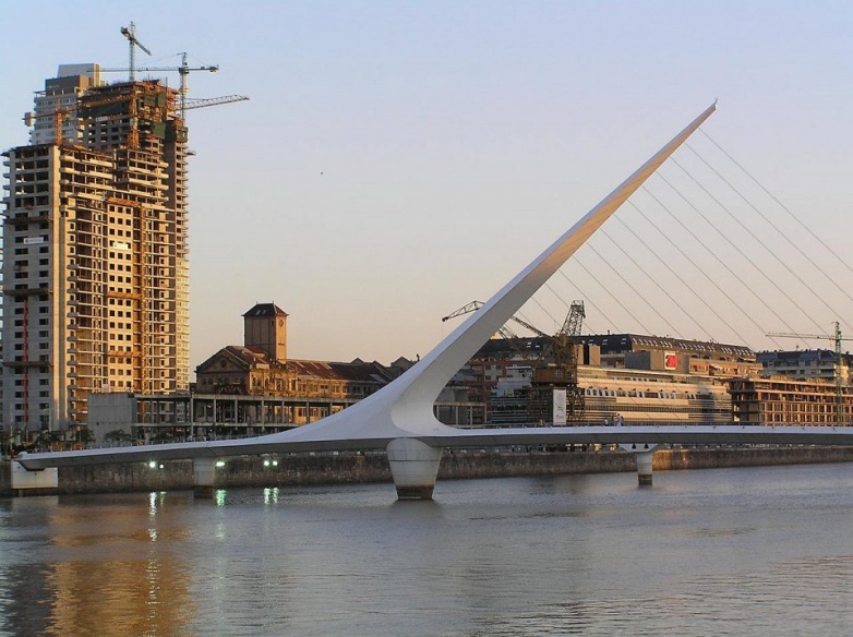 Мост ЖенщиныПуэнте де ла Мухер (мост Женщины) является вращающимся пешеходным мостом в Пуэрто Мадеро — коммерческом районе Буэнос-Айреса, Аргентина. Он представляет из себя канатный разводной мост, но сама концепция его разведения крайне необычна. У него есть единственная мачта с кабелями, поддерживающими часть моста, которая вращается на 90 градусов, чтобы позволить водному транспорту пройти мимо. 170-метровый пешеходный мост весит 800 тонн, 6.2 м шириной и разделен на две неподвижных части, 25 м и 32.5 м длиной соответственно. Средняя секция достигает 102.5 метров, вращаясь на белой бетонной опоре, позволяя судам пройти меньше чем за две минуты. Эта центральная секция поддерживается стальной «иглой» из бетона 34 метра высотой. «Игла», наклоненная под углом в 39 °, поддерживает центральный промежуток с помощью кабелей. Компьютерная система в восточном конце моста управляет поворачивающимся механизмом при необходимости.