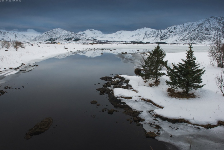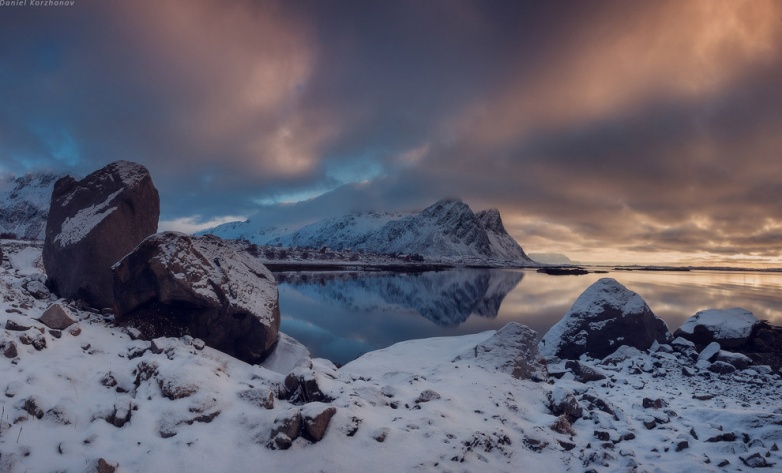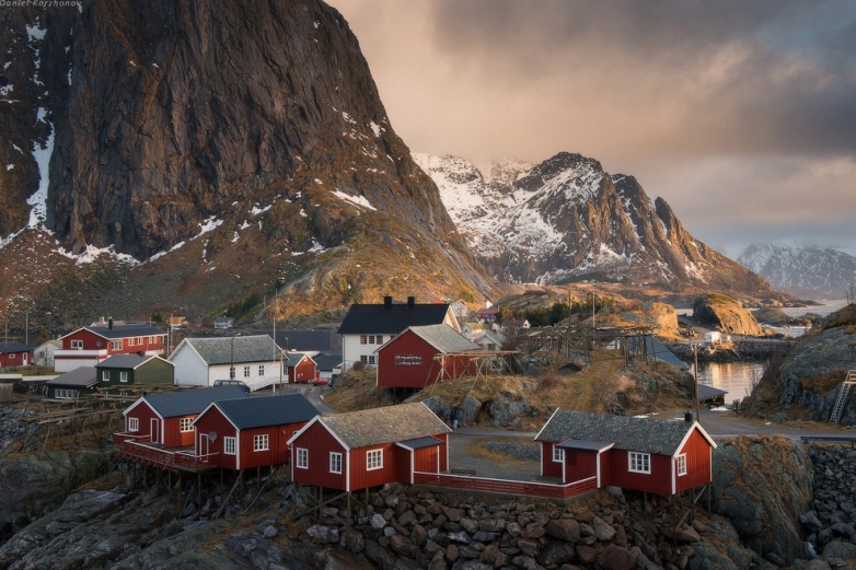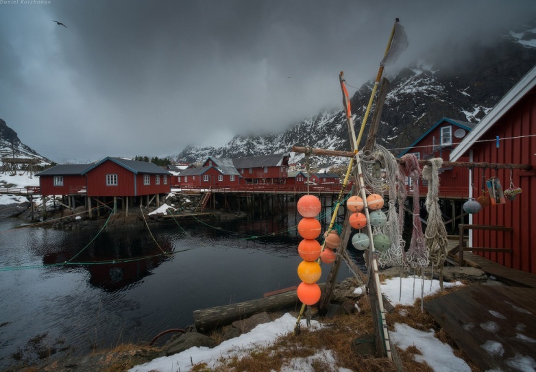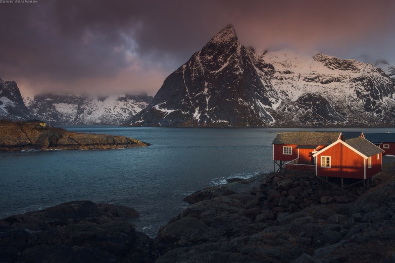 Проезжая вдоль зигзагов фьордов по обледенелой дороге по пути к нашему домику в Рейне, мы удивлялись, что архипелаг выглядит как закрытая стена, 400-1000 метров высотой. С одной стороны, с северо-запада — норвежское море, а с юга — Вестфьорд. Почти все деревни расположены именно со стороны Вестфьорда: норвежцы предусмотрительно не стали «подставлять» бока своих рорбу суровым ветрам Арктики. Зато вершины и пляжи, обточенные ледяными порывами северного ветра, потрясают воображение: художнику сложно представить что-то более монументальное и великолепное, чем рассвет над северными пиками архипелага. В этот момент низким розовым солнцем подсвечиваются заснеженные остроконечные вершины-зубцы хребта дракона, спящего в прозрачной изумрудной воде фьорда.