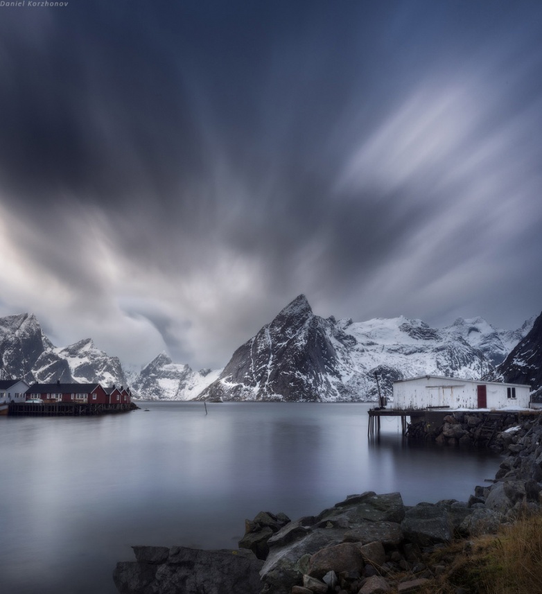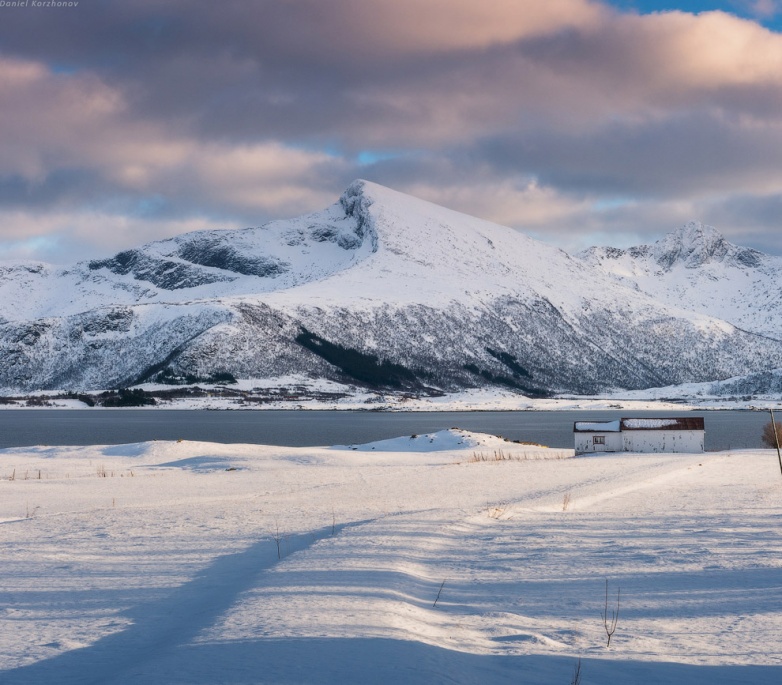 На Лофотенах очень много одиноких домиков, это одна из моих любимых тем. В сравнении с маленьким домиком горы выглядят очень высокими во всём своём снежном великолепии.
