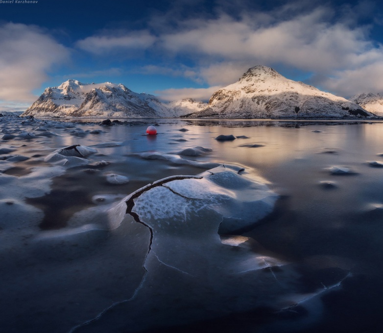 А если отъехать в центральную часть Лофотен, то можно увидеть такое удивительное явление: как замерзший в прилив фьорд разбивается о камни — и образуются такие удивительные цветы.