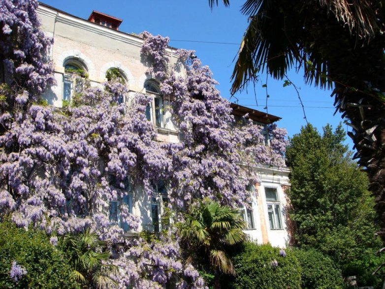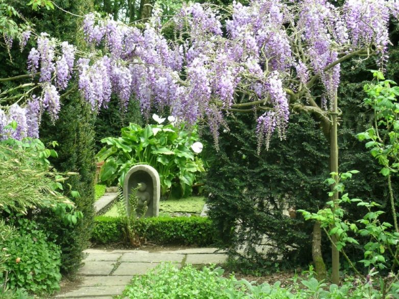 Глициния (вистерия) — это лиана, которая предпочитает обвиваться вокруг опор. Опорой может служить другое дерево, беседка, стена здания.