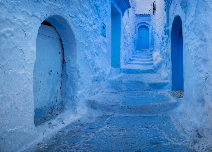 Шефшауэн — удивительный цветной город-облако Марокко, знаменит он тем, что его стены окрашены небесно-синим и белым цветами. А дополняют индиго терракотовые крыши, тёплым оранжевым цветом оттеняя холод стен. Если бы меня попросили нарисовать его, то картина выглядела бы примерно так: тихая утренняя улица с покосившимся домиком, детвора играет в футбол. А маленьких деток, топающих с портфелями, уже ждёт мама на пороге дома, открыв бирюзовую арку-дверь, полукруглую, какие обычно бывают у домиков хоббитов. На окошке рядом с петухом умывается кошка. Несколько мужчин вразвалочку совершают свой вечерний моцион в серых шерстяных джелабах, национальных рубахах с острым капюшоном и длинными полами. А над глубокими синими морщинами города высятся Рифовые горы. И синее небо, куполом повторяющее цвета города.