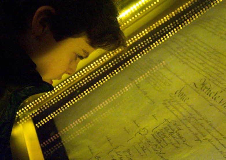 25. Ученик средней школы смотрит на первую Конституцию США в Национальных архивах, именуемых «хранителем истории нации». В архивах не только хранится Билль о правах человека и Декларация Независимости, но и военные записи и документы о принятии гражданства.