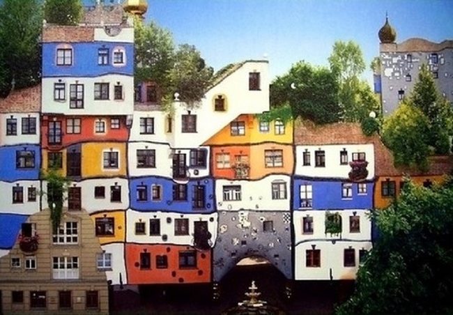 Дом Хундертвассера уже давно пользуется заслуженной популярностью у туристов. Трудно поверить, что заказчиком данного проекта стали власти Вены, тем не менее именно это здание должно было стать образцом для строительства других жилых и муниципальных зданий города. Своим оригинальным строением архитектор хотел выразить важную для современного общества концепцию — индивидуальность каждого человека. По этой причине здание и разделено множество разноцветных секторов. Хундертвассер хотел чтобы каждый житель дома сам раскрасил пространство около своего окна. Кроме того, архитектор считал окна одной из важных составляющих внешнего облика дома, поэтому при строительстве было использовано 8 различных видов окон, имеющих к тому же разные размеры. Второй важной идеей автор считал мысль о единении человека и природы. Поэтому при оформлении дома и использовал такие природные мотивы, как трава и кустарники, деревья, аппликации на стенах в форме птиц и животных. А неровный пол скорее напоминает горные дорожки или лесные тропы. Тем не менее, дом отвечает всем нормам противопожарной безопасности и другим требованиям. В доме имеется 50 жилых квартир.