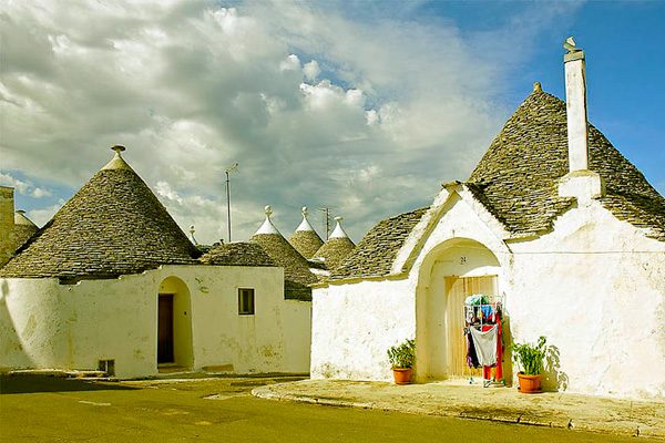 Узкие провинциальные улочки этого городка напоминают иллюстрации из милых сердцу детских сказок, на которых изображены домики гномов. Кровли домов имеют конусообразную, пирамидальную и купольную формы, которые делают постройки уникальными в своем роде. Называются такие домики «трулли», что в переводе с латинского означает «купол». Сами стены сложены без применения раствора из блоков известняка, подверженных грубой обработке и тщательно выбелены известковым раствором, а кровли покрыты каменной черепицей с нанесенными на нее магическими знаками и символами. История появления этих своеобразных домиков началась еще в 11 веке.