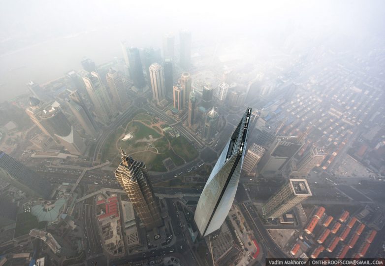 Вид на стройку. Справа — из облаков торчат высоченные небоскрёбы Цзинь Мао (421м) и Шанхайский всемирный финансовый центр (492м):