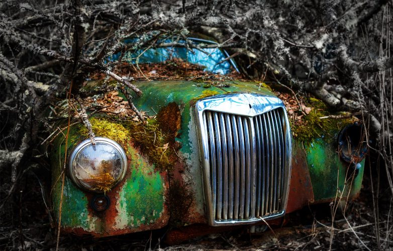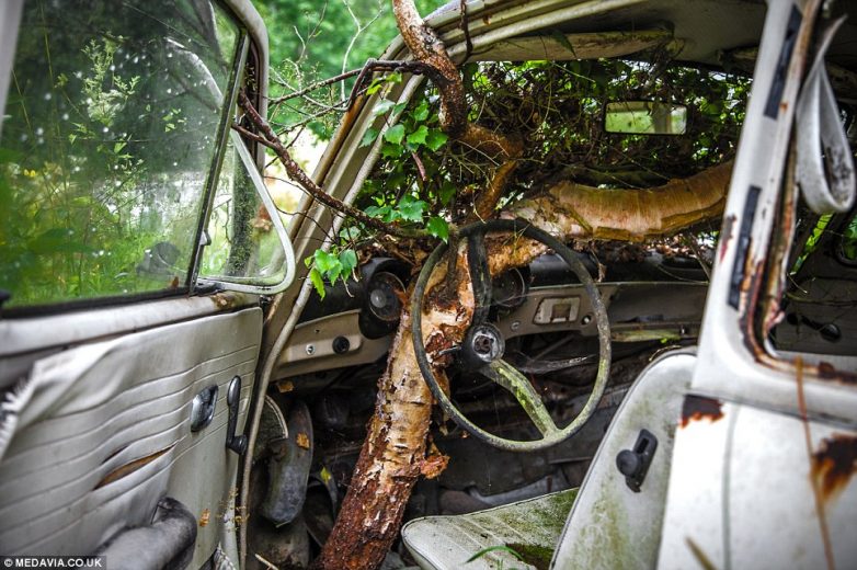 Природа потихоньку поглощает ретро-автомобили. Здесь деревья уже пробрались внутрь кузова, как бы примеряя на себя роль водителя.