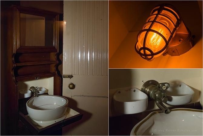 А вот умывальник. Стоит, правда, в тёмном углу и мало кто его замечает (свет от моей фотолампы и желтого «аутентичного» фонаря). Создатели выставки местами весьма увлеклись созданием загадочной атмосферы полумрака.