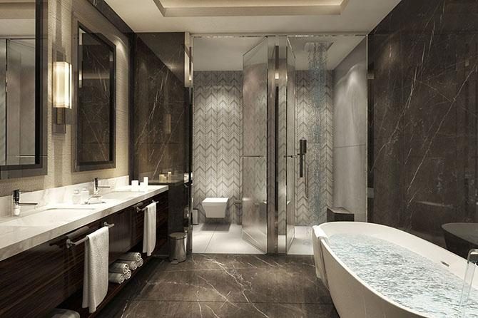 В распоряжении гостей, выбравших апартаменты, — две спальни с большими кроватями, большой обеденный стол на 10 персон и отдельная кухня. Основная ванная комната отделана итальянским мрамором. Здесь есть и душевая кабина, и джакузи. Также в номере обустроили не только гостиную, но отдельную ванную для гостей. В люксе нашлось место и хаммаму.