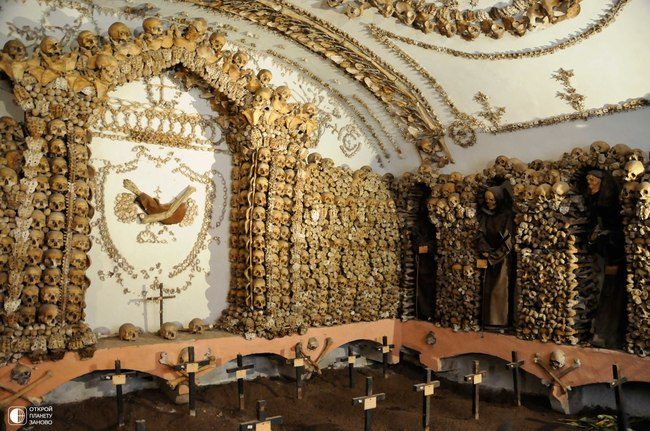 Нет ничего удивительного в том, что название капеллы дословно переводится как «Часовня из костей». Она действительно выстроена из человеческих костей и черепов, соединенных с помощью раствора и заменивших кирпичи. Капелла была построена в 16 веке францисканским монахом, который в духе того времени, стремился донести своим братьям по вере мысль о неизбежности смерти. Над входом в капеллу есть надпись, которая гласит: «Кости, которые здесь, ждут ваших костей». Внутренне убранство этой мрачной часовни, состоящей из трех пролетов, полностью состоит из костей и черепов, а потолок расписан фресками на тему смерти. Количество скелетов монахов приблизительно равно 5000, все они собраны на соседних кладбищах, которые были разрушены. Два высушенных трупа, один из которых принадлежит ребёнку, свисают с цепей. На крыше часовни написана фраза «Лучше день смерти, чем день рождения». Мрачноватое, в общем-то, место пользуется огромной популярностью у туристов, желающих пощекотать себе нервы.