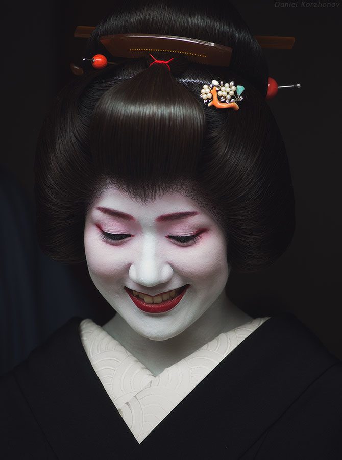 Интересна и причёска гейко: говорят, она содержит много острых предметов, чтобы девушка смогла обороняться от клиентов, которые зайдут слишком далеко. Со стороны причёска выглядит совершенной. Майко и гейко носят её по 5 дней в неделю. Это не проходит просто так: со временем макушка у гейко лысеет, из-за того, что постоянно оказывается давление на волосы. Но заметить это невозможно, если волосы собраны. Гейко и майко оставляют на шее по 2 или 3 вертикальные полосы не закрашенными пудрой, и оставляют уши открытыми. У японцев принято считать, что шея и уши – самые красивые части тела. А полоски позволяют визуально удлинить шею, сделать её более грациозной.