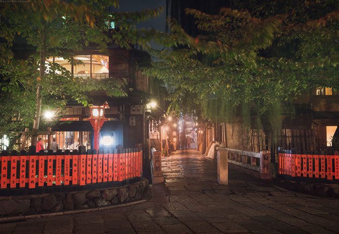 Квартал Гион находится неподалеку от чудесных ивовых аллей, вдоль водных каналов изящно свешивающих свои ветви. Здесь и поныне сохраняют традиции воспитания гейш. В Японии же более принято называть гейш «гейко», что значит «человек искусства», взамен слова «гейша», что означает «актриса»…