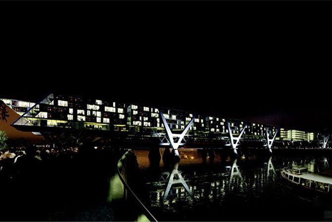 Проект жилого моста от бюро BRT Architekten. Сооружение длиной 700 метров, перекинутое через разветвленный участок Эльбы, должно значительно улучшить транспортную ситуацию в районе и стать новым центром притяжения. Нижний уровень отведен под автомагистраль, второй – под 16 жилых корпусов, между которыми будет озелененная прогулочная зона с кафе и бутиками. В центре моста появится бизнес-центр напоминающий две огромные прямоугольные рамки.