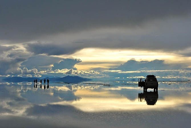 Начнем со знаменитого озера Уюни (Салар де Уюни), самого большого в мире солончака, где после дождя создается очень интересный эффект зеркала. Уюни очень популярен среди туристов и путешественников, здесь есть даже отель, полностью построенный из соли.