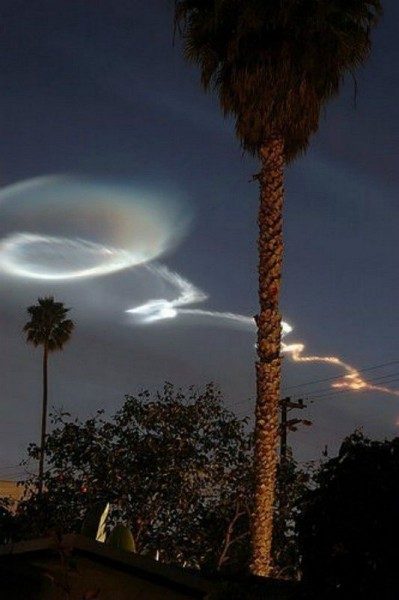 След от ракеты минотавр, выпущенной ВВС США в Калифорнии. Воздушные потоки, дующие на разных высотах с различной скоростью, вызывают искажение следа ракетных выхлопов. Атмосферные капельки воды, растаявших кристалликов льда тоже вызывают разложение солнечного света на различные цвета радуги.