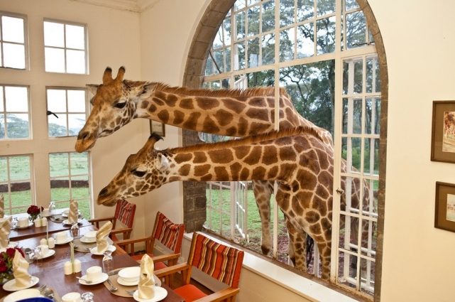 Отель Giraffe Manor – единственный отель в мире, где туристы завтракают с жирафами. Гостиница из шести номеров находится в пригороде Найроби посреди питомника для жирафов. Жирафы спокойно бродят по территории отеля и вполне могут разбудить вас, заглянув в окно номера. Они приходят к гостям отеля, как правило, во время завтрака. Постояльцам разрешено кормить животных, в каждой комнате обязательно имеется специальный корм.