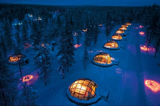 Гости финского отеля Kakslauttanen могут любоваться северным сиянием и снегопадом, прямо лежа на кроватях своих номеров, выполненных в виде стеклянных иглу. Странные светящиеся полусферы издалека можно принять за поселение инопланетян. В отельном комплексе находится самый большой в мире ресторан из снега, финская сауна и 8-миметровый стеклянный вигвам для конференций.