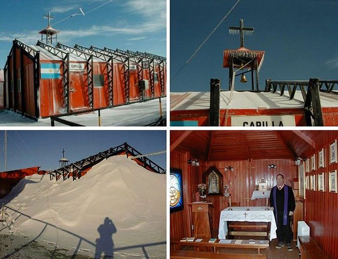 Самая южная церковь в мире расположена в ледяной пещере на аргентинской полярной странции Бельграно II. День и ночь здесь чередуются с интервалом в 4 месяца, а в ночном небе можно наблюдать южное полярное сияние.