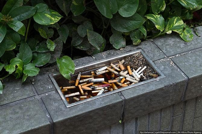 Чтобы бычки не кидали в клумбы, на парапете сделали пепельницы.