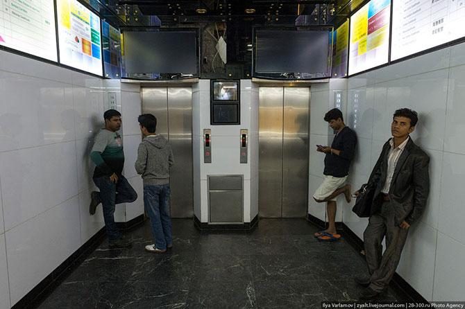 Холл какого-то старого здания, где живут гастарбайтеры. На экранах выводится картинка с камер в лифтах – безопасность превыше всего. Хорошее решение, кстати.
