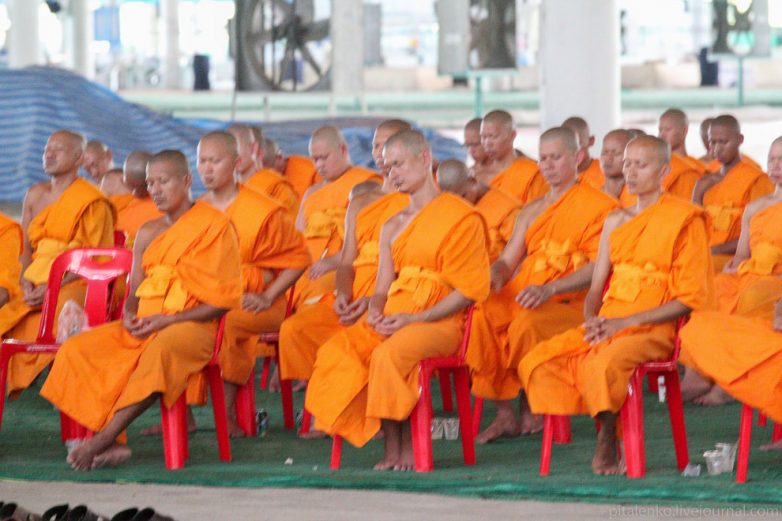 В основном — монахи. Они сидят на полу и на стульях большими группами. В этом комплексе их пара тысяч человек. Звучит гипнотическая музыка, странный голос что-то говорит на тайском языке и по сотням телеэкранов показывают, как тысячи людей-тайцев отдают пожертвования монахам.