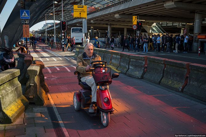 Голландские инвалиды, вместо того, чтобы дома сидеть, гоняют по велодорогам на электроколясках. Еще и радуются.