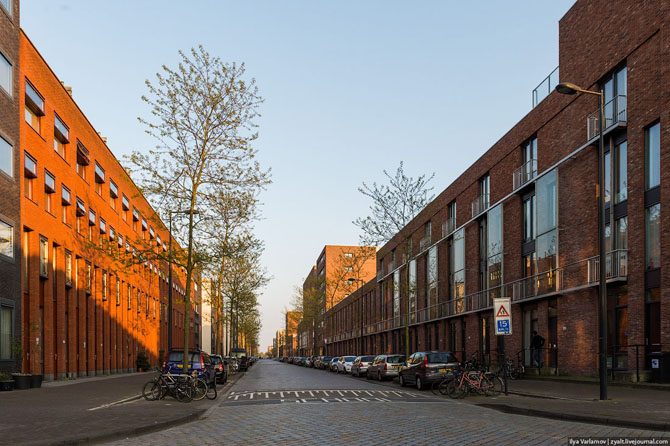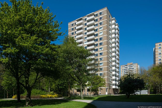 Жилой квартал на окраине. Ни одной машины во дворах, все убрали под землю.