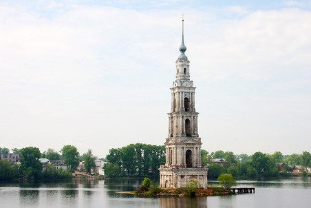 От богатого купеческого старинного волжского города сегодня осталась по большому счету лишь белоснежная колокольня бывшего Николо-Жабинского монастыря, одиноко стоящая посреди реки и впечатляющая заезжего путника своей красотой. Значительную часть Калязина вместе с торговой площадью и историческим центром затопили при сооружении Угличского водохранилища. По одной из версий, колокольню оставили для тренировок парашютистов. Ни один теплоход, проходящий в сезон мимо городка, не обходит стороной удивительную колокольню. Если договориться с кем-нибудь из местных, можно добраться до островка на моторке и увидеть все детали своими глазами.