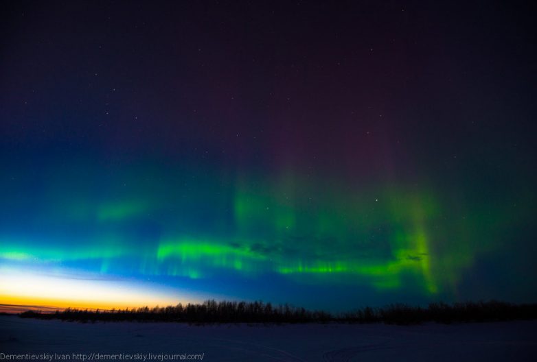 С кем бы я не разговаривала про северное сияние, мне в один голос говорили, что в апреле уже поздно ловить ночную жар-птицу: и ночи короткие, и холода уже не те. Но как показывает практика, если сияние довольно мощное, его видно даже когда небо ещё не стало полностью тёмным.