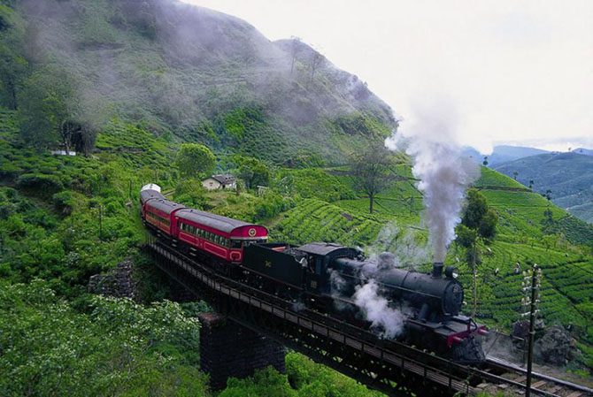 Паровоз тянет поезд через чайные плантации в Нувара Элия — Коломбо, Шри-Ланка.