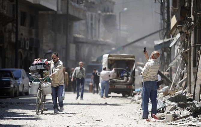 Местный житель делает фотографию на память, Хомс, 13 мая 2014.