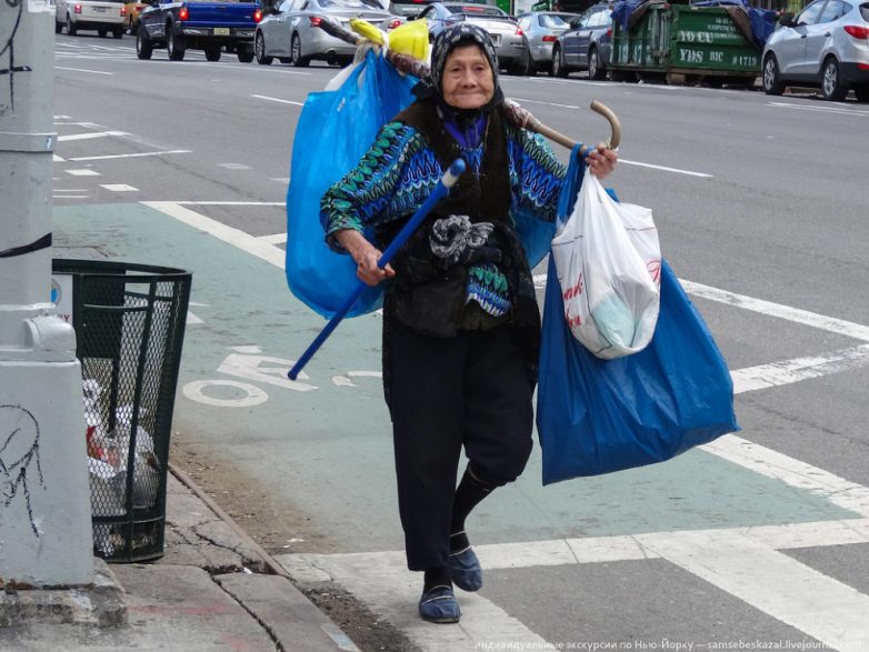 21. Китайская бабулька собирающая пустые пластиковые бутылки на Манхеттене. Такие ходят с утра до вечера по всем районам города, заглядывая в каждую мусорку по пути и копошась в больших пакетах, лежащих на тротуарах перед зданиями. Вечером или рано утром, набрав огромные полиэтиленовые мешки бутылок, они собираются у грузовика китайского скупщика. Дневной заработок составляет 20-30 долларов. За одну бутылку дают 5 центов.
