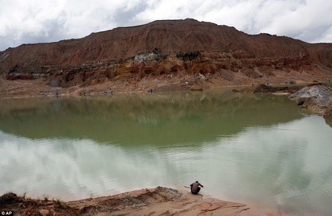Мальчик играет на берегу воронки, сделанной золотодобытчиками во время разработок золота. Экологический ущерб такими варварскими способами добычи золота местной флоре и фауне был нанесен огромный.